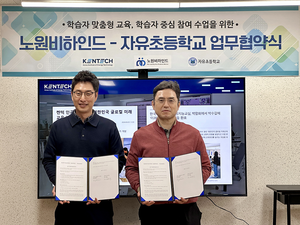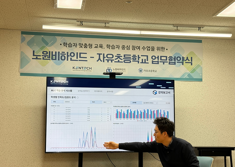 노원비하인드는 ‘교실 속 단 한 명의 학생도 놓치지 않고 모두의 학습 성공을 이끌겠다’는 의미를 지닌 한국에너지공대 교원의 창업 기업이다. 이번 자유초등학교와의 업무협약은 협력 범위를 일선 경기도 초등학교 교육현장으로까지 확대했다는 의미가 있다.